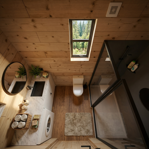 Despite its smaller size, the Northern Light 10×28 offers a full bathroom with a shower, flushing toilet, and vanity, plus space for a washer. All plumbing runs through the insulated walls, ensuring reliability even in extreme climates. Spray foam insulation under the floor and batt insulation in the walls and ceiling maintain year-round comfort and efficiency, making the bathroom feel just as functional as in a traditional home.
